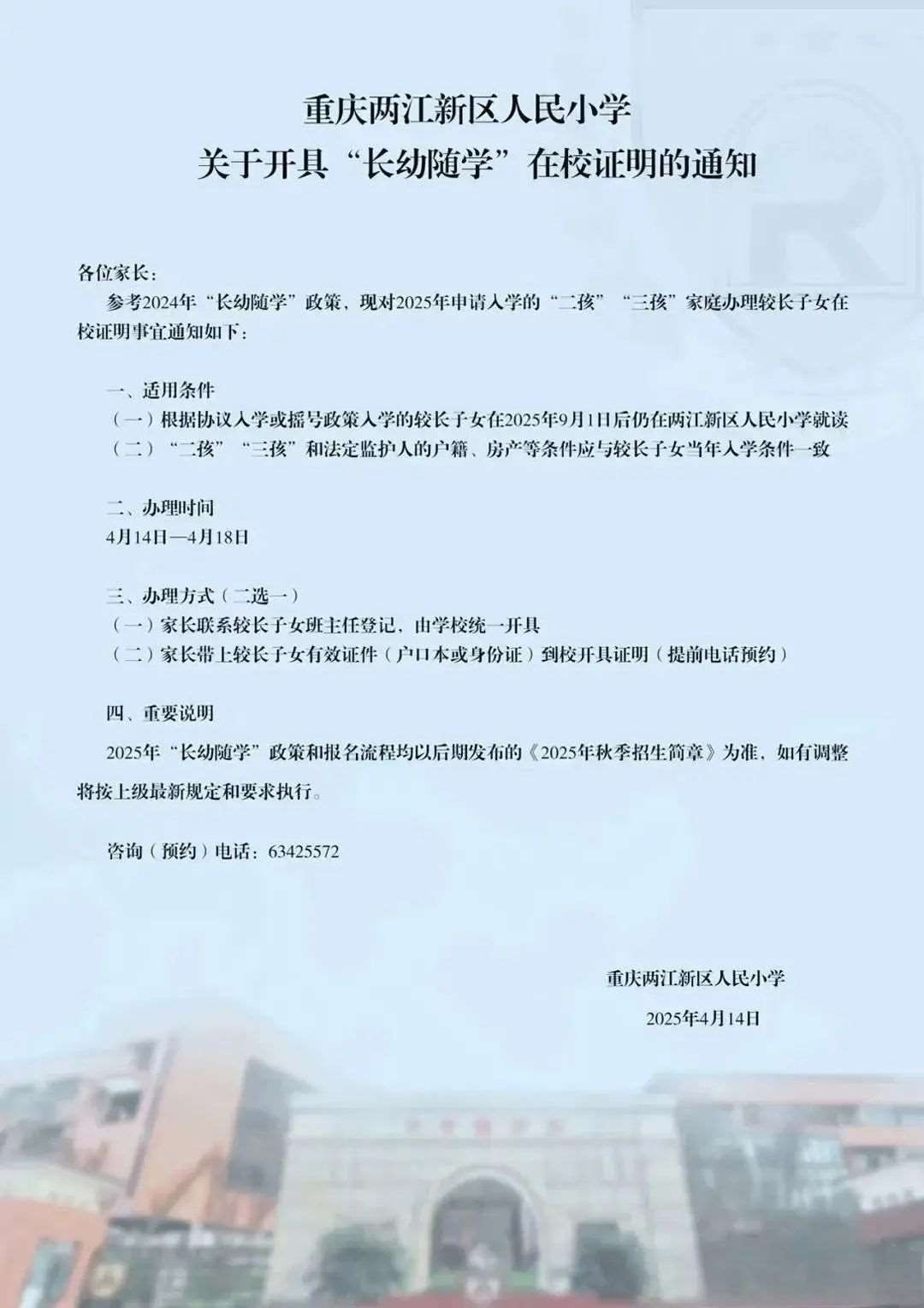 “长幼随学”情形除必须及情形材料外还需提交:较长子女在校证明或学籍信息。——规定时间内到校开具。